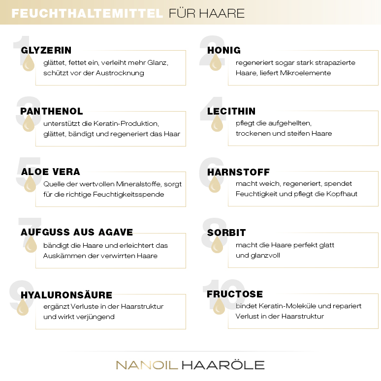 Feuchthaltemittel können den Haaren zusammen mit den Substanzen geliefert werden, die für die Feuchtigkeitsspende verantwortlich sind. Sie können aber auch selbst auf Haare aufgetragen oder mit natürlichen Ölen vermischt werden. Es gibt ebenfalls die Möglichkeit, fertige Kosmetikprodukte mit den Feuchthaltemitteln zu kaufen, beispielsweise eine Haarmaske oder einen Haarbalsam. Zu den in Kosmetikprodukten am häufigsten angewandten Substanzen, die für die Feuchtigkeitsspende verantworten, gehören: