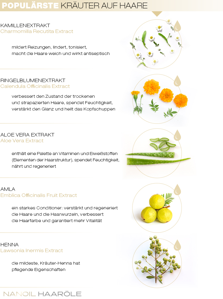 Die natürlichen Kräuter und Pflanzen garantieren dann die beste und effektivste Wirkung, wenn sie zusammen vermischt werden. Die angemessen bilanzierten Mischungen aus verschiedenen natürlichen, qualitätsvollen Substanzen sind die bestmögliche Haarkur. Die perfekte Idee ist, verschiedene Kräuter und Pflanzenextrakte mit den natürlichen Ölen zu verbinden. Eine genau überlegte und präzis bilanzierte Mischung ist ein Schlüssel zu gesunden, dichten und schönen Haaren.